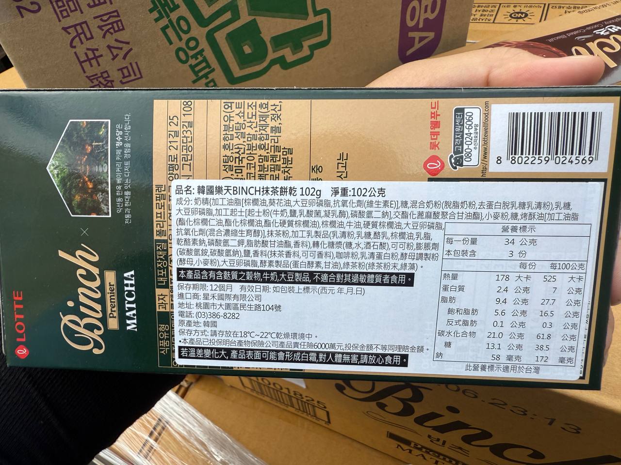 韓國 樂天 BINCH 抹茶餅乾/巧克力餅乾 102G*20盒